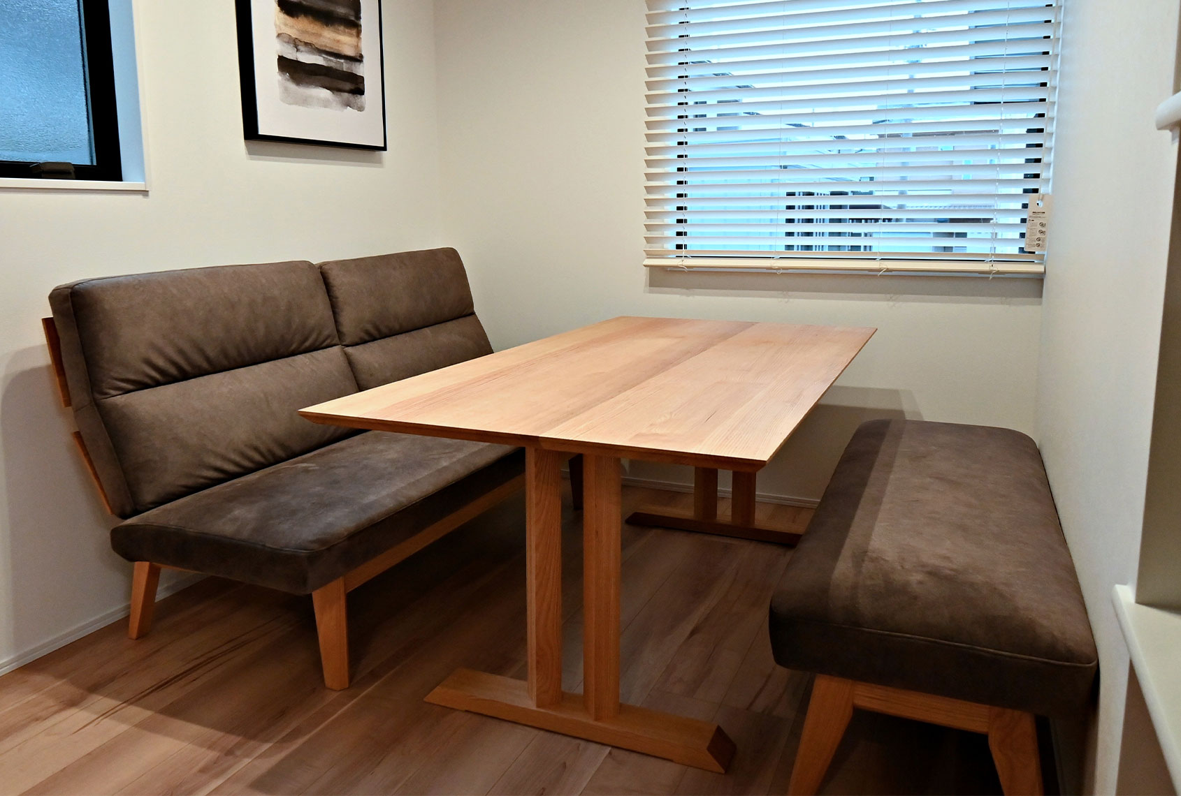 ただ、そこから家具を選ぼうにも、新築のダイニングの空間が狭いという事もあり、どう家具を配置するか?カフェやレストランのような特別な空間にしたい! という想いはあっても、どうやったら実現できるのか?自分たちでネットで調べてみても、結局答えは出ず…とにかく悩んでいました。そこで、図面を持ち込み、島津さんに家具の配置やコーディネートまでお願いしてみることに…。そして、忘れもしないプランボードでのご提案の日、SOLIDでご提案いただいたソファとベンチが、自分たちの要望にぴったりで、なんて居心地がいいんだろうと、感動しました・・・!狭い空間でも、家具をズラす事なく、容易に出入りが出来るよう配慮された、テーブル脚の形状。明るい家族団欒の空間にしたい!という要望には、リビングとは異なる、オーク材を提案いただきました。まさに、自分たちが理想としていた提案に、驚きました!きっと時間を掛けて、徹底して考えてくれたんだろうな・・・と。最終的には、実際に家族皆で過ごしている姿が想像ができ、新築での暮らしが楽しみになったのが、決め手として大きかったです!